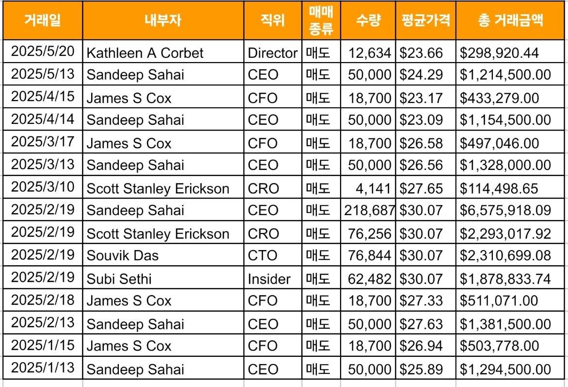 CWAN(클리어워터 애널리틱스) 내부자 매도는 2023년도부터 시작하여 매년 활발하게 발생하고 있습니다.