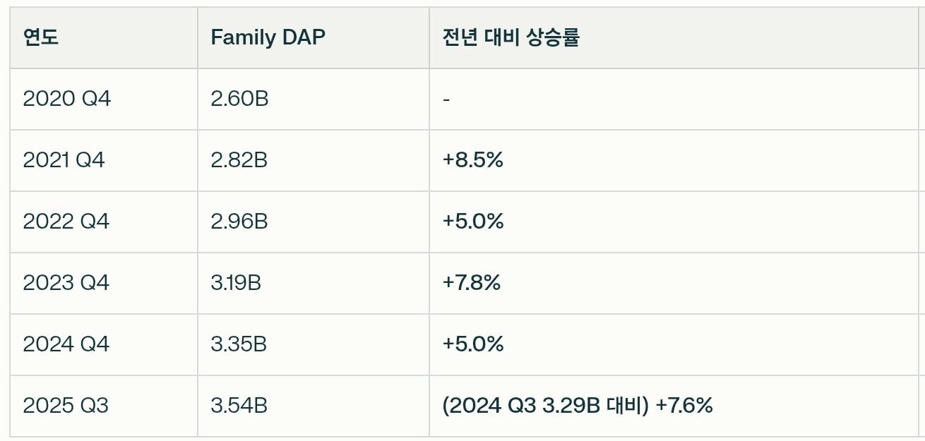 사용자 지표: 일일 활성 사용자(DAP)는 35.4억 명으로 견고한 확장세를 유지하고 있습니다.
